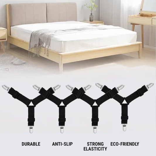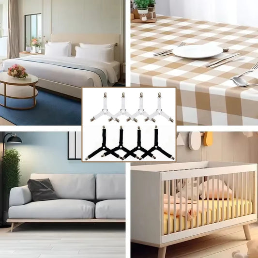 Keep your sheets wrinkle-free with these adjustable bed sheet clips. Durable 3-way design, elastic straps, and easy-to-use clips for a snug, secure fit. Transform your bed-making routine combining functionality, durability, and ease of use to keep your sheets perfectly in place!