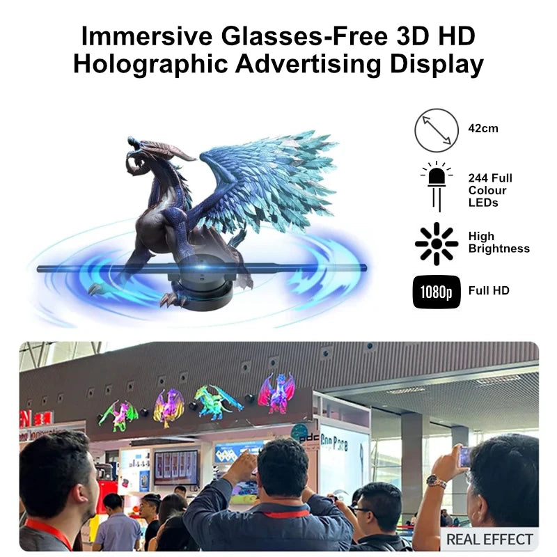 Capture attention with an Immersive Glasses-Free 3D Hologram Fan Display. This HD 3D holographic projector is perfect for advertising in stores, bars, and parties, or creating eye-catching displays for Christmas and Halloween. Ideal for dynamic visual marketing.