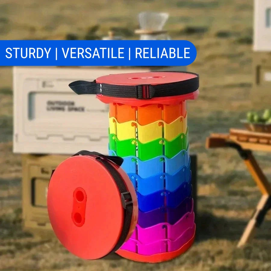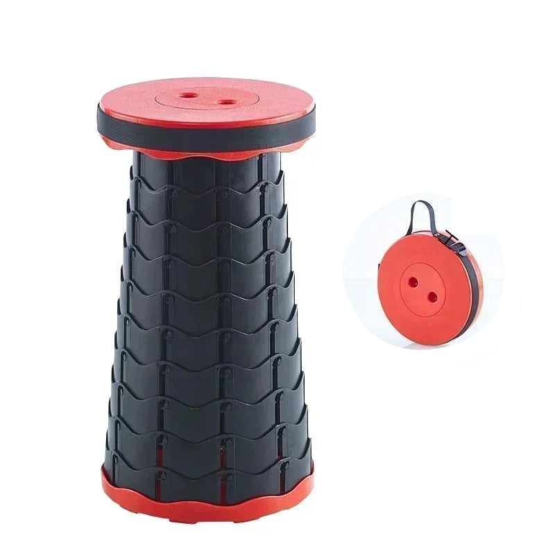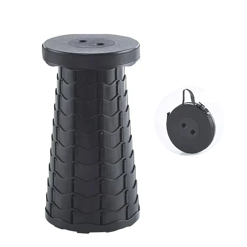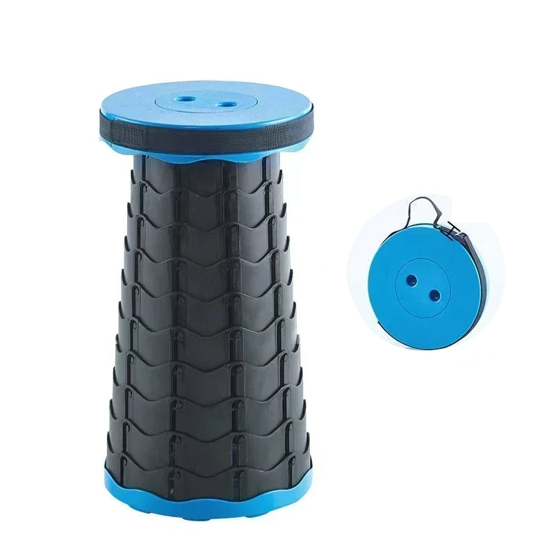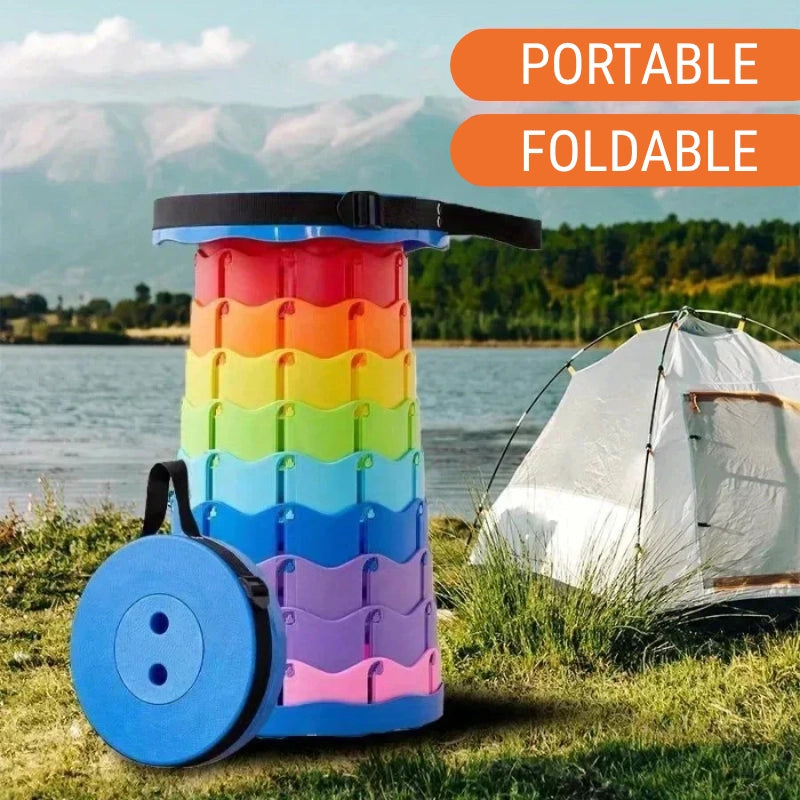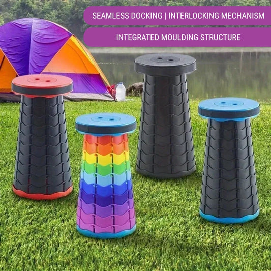Lightweight, portable telescoping stool with adjustable height, 360° rotating cushion, and high load capacity. Perfect for camping, fishing, queues, and more. Durable and compact design for easy carrying.