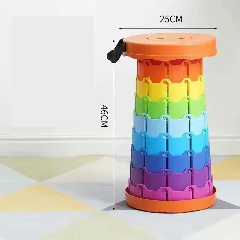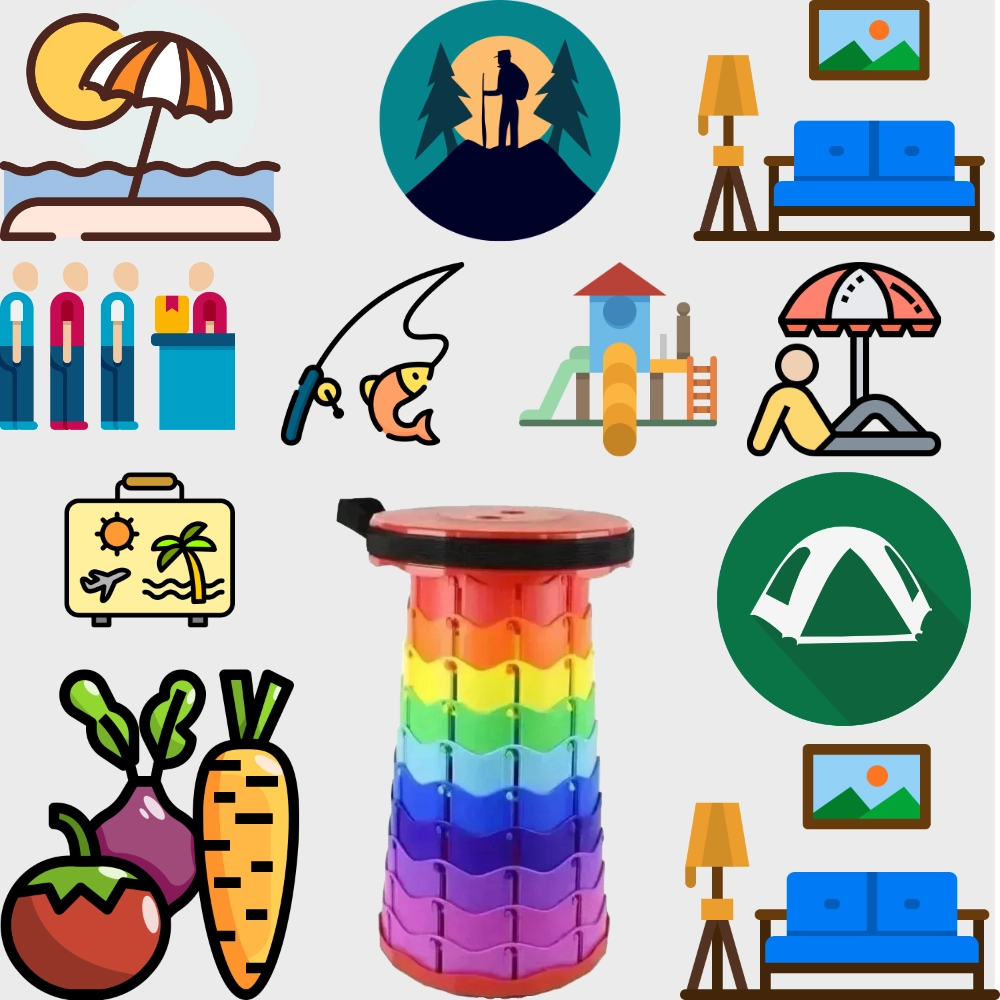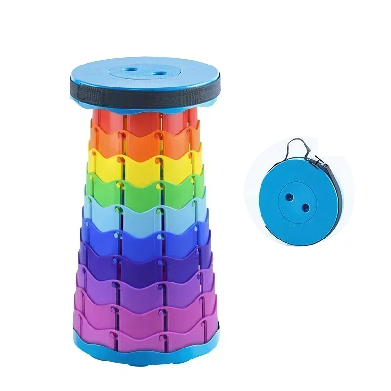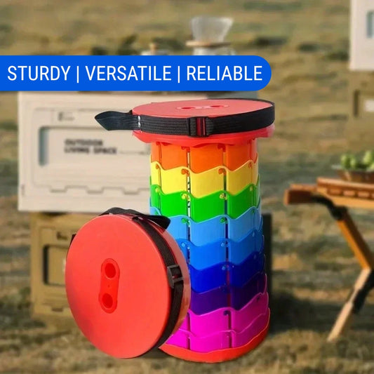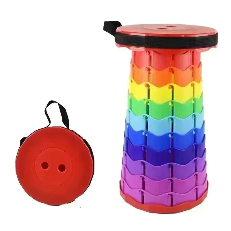 Lightweight, portable telescoping stool with adjustable height, 360° rotating cushion, and high load capacity. Perfect for camping, fishing, queues, and more. Durable and compact design for easy carrying.