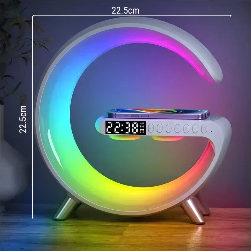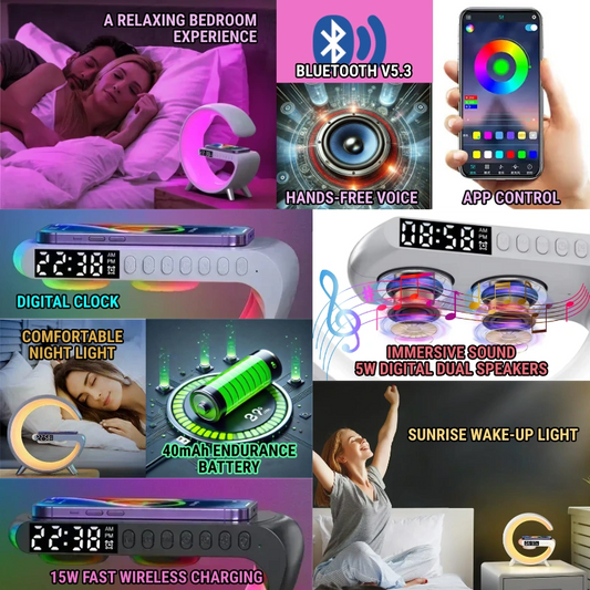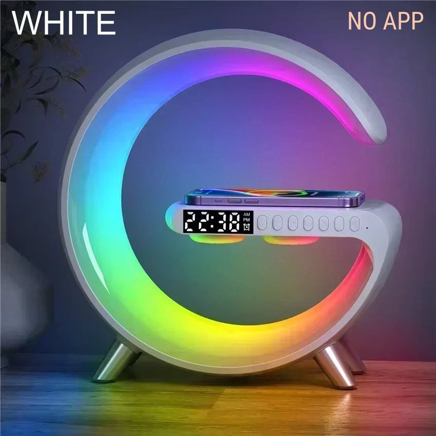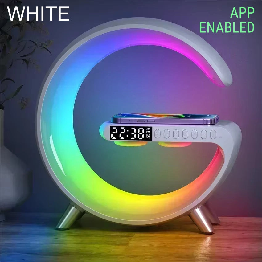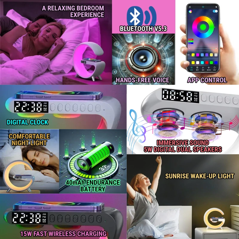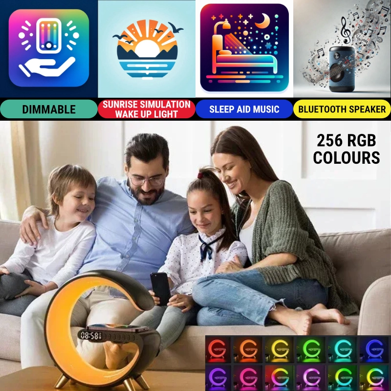 Elevate your bedside with this multifunctional LED wake-up light. Features RGB lighting, Bluetooth speaker, 15W wireless charging, sunrise alarm, and app control for a seamless bedroom experience. With and without APP [mobile managed & manual options].